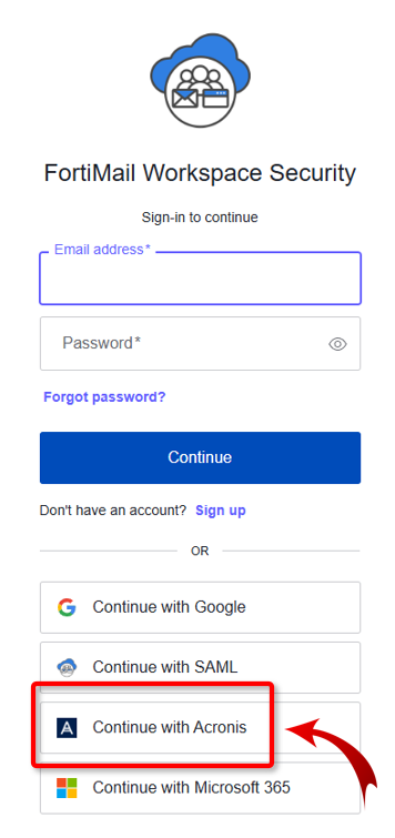 The admin user can then access "Acronis Email Security" from this URL [https://acronis.perception-point.io/] using the "Continue with Acronis" option in the sign-in process.