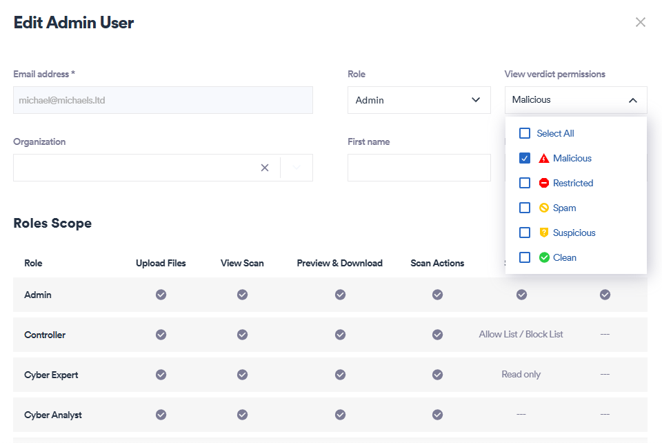 It is possible to restrict the ability of any admin user to view scans - depending on the verdict of the scan. For example, you could permit a specified admin user to see scans with Malicious verdicts, but not with any other verdicts. You can also prevent a specified admin user from viewing any scans - but not permitting the admin user to view scans with any verdict.