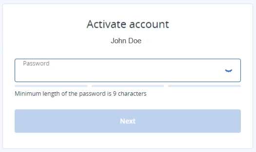In the Activate account pop-up that appears, the new admin-user should enter a password to activate the new account, and then click Next.