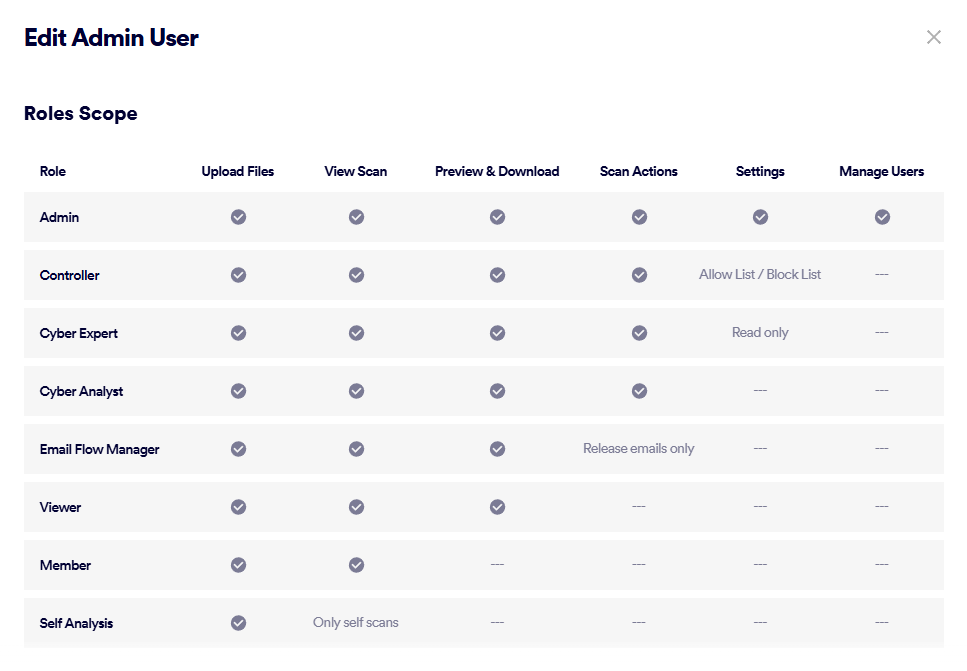 Limitation: Although in "Acronis Email Security" you can modify the role that is assigned to an admin-user, when the admin-user signs-out of "Acronis Email Security" and then signs back-in, the user's role will be reset to "Admin". See About admin-user roles above. However, you can change the scans that an admin user is permitted to view, based on the scan verdict. For details, seeEditing permission to view scans based on verdict. |