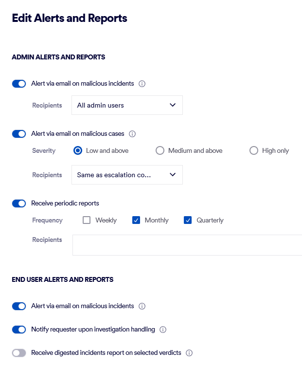 Configure the required settings for admin users and end-users. See Admin alerts and reports - options below.