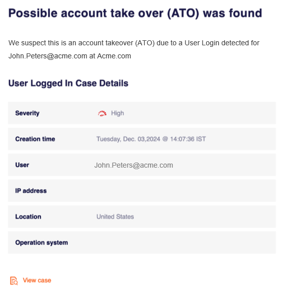 When enabled, an email alert will be sent each time a case is added to the Account Takeover page. The email alert is sent to the specified admin users only, not to end users. For details about these cases, see Account Takeover [ATO].