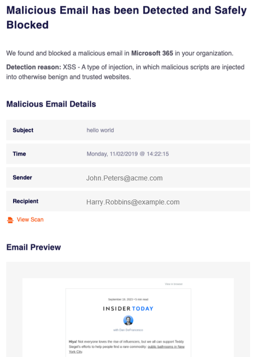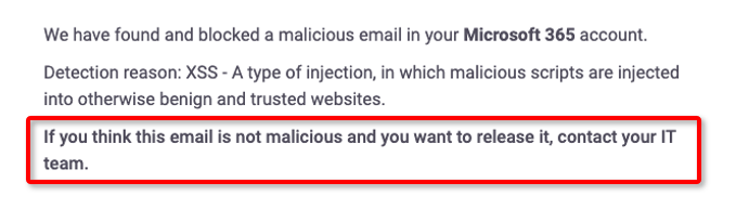 An email alert will be sent each time an email or a file is assigned a malicious scan verdict. [Email alerts are not sent in response to emails or files that are assigned a restricted or spam scan verdict.] The email alert is sent irrespective of whether or not the email or file was quarantined. The "warning" email will be sent to the intended recipient of the original email or to the owner of the file. The "warning" email will have the subject similar to "A malicious email has been detected and blocked" If the recipient of the email alert thinks that the email or file is not malicious, the recipient can request their IT security team to investigate the scan - and to release the email or file from quarantine, if the email was quarantined.