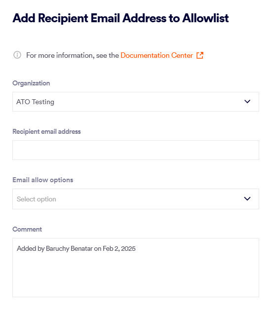 Specify the email address of the recipient. Emails to this recipient will be allow-listed.