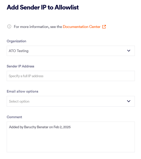 Specify the IP address of the sender. Emails from this sender IP address will be allow-listed.