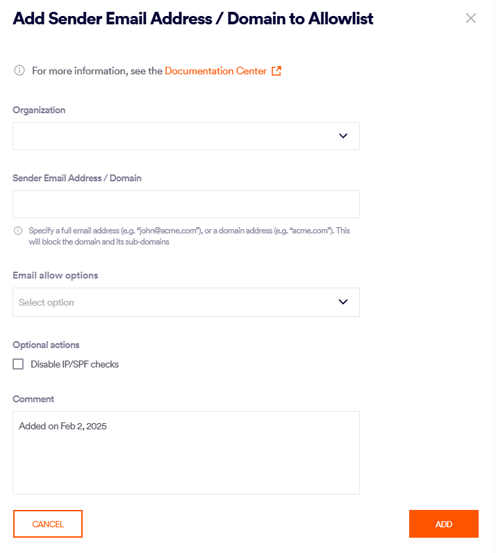Note: If you do not select one of the "Email allow options", then the allowlist entry will not be functional.