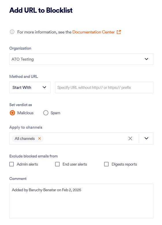 Note: You won't be able to see any custom blocklist entries in the Allowlists & Blocklists page in "Acronis Email Security". Custom blocklist entries are visible to "Acronis Email Security" Support only. |