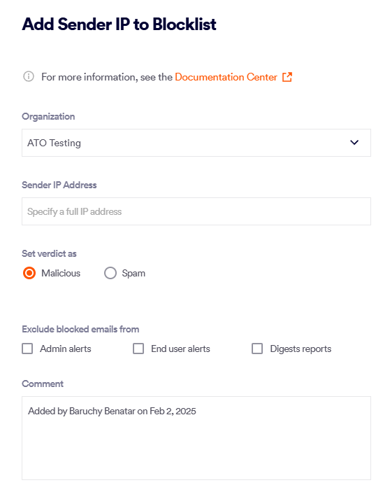 Specify the IP address of the sender. Emails that originate from this IP address will be block-listed.