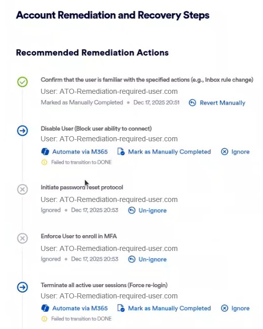 All the above mitigation procedures can be performed either manually or via the Microsoft 365 integration. Typically, they should be performed in the order shown above.