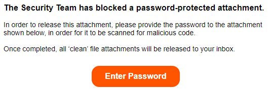 "Acronis Email Security" can be configured so that when a password-protected file is attached to an email, and "Acronis Email Security" isn't able to open the file, then the file will not automatically assumed to be clean. In stead, the parent email will be assigned a clean verdict and quarantined. "Acronis Email Security" will then send an email to the original target [recipient] of the email, requesting the recipient to provide the password for the password-protected file.