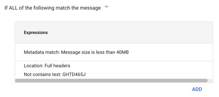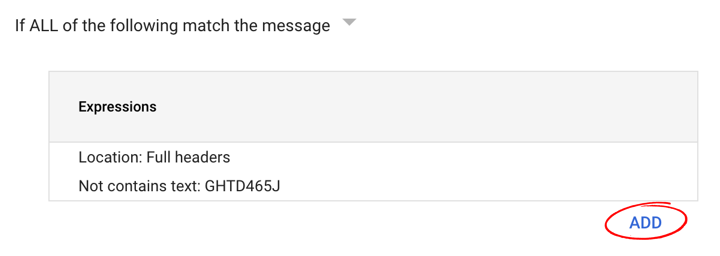 Under "2. Add expressions that describe the content you want to search for in each message", in the first drop-down menu, select "If ALL of the following match the message"