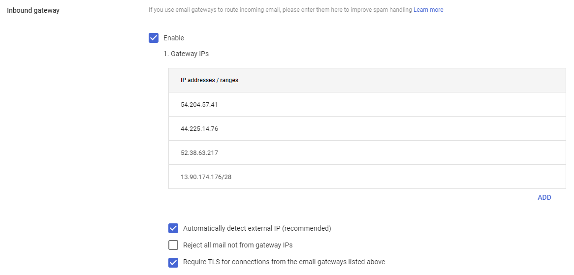Depending on the environment of your organization, add the following IP addresses to your inbound gateway: