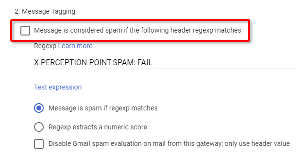 In the Regexp text box, enter X-PERCEPTION-POINT-SPAM: FAIL