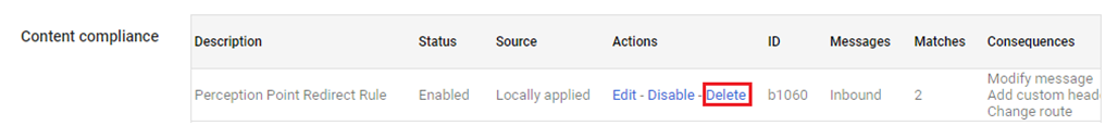 In the Content compliance section, delete the Perception Point Redirect Rule.