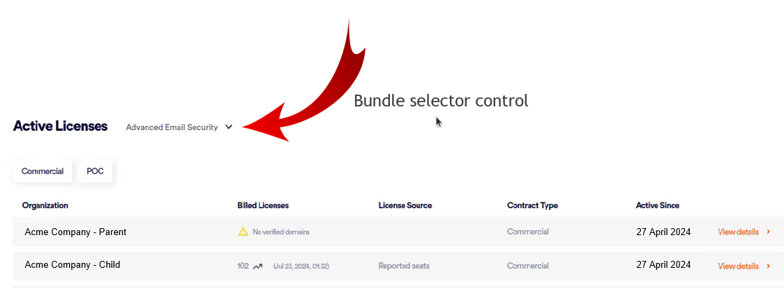 ] to select for which bundle to display the licensing information. The list of bundles includes all bundles that are assigned to any of the child organizations.