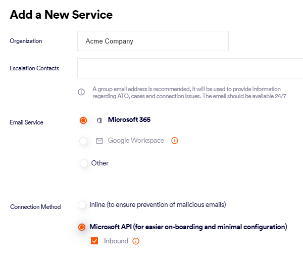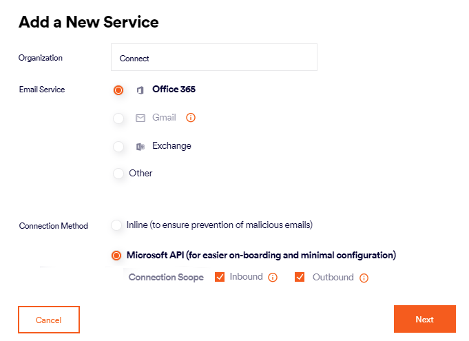 If the Microsoft 365 Inline Inbound integration is already configured in your organization, then the Inbound check box should be cleared, and the check box should be disabled.