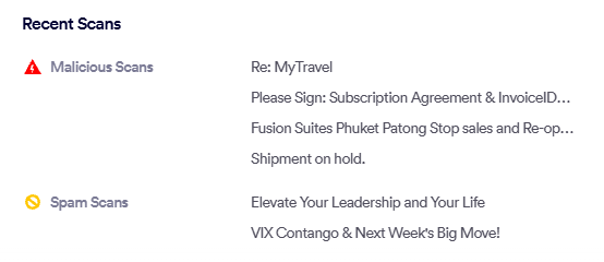 The list shows a maximum of 5 malicious and 5 spam scans that were received by the user.
