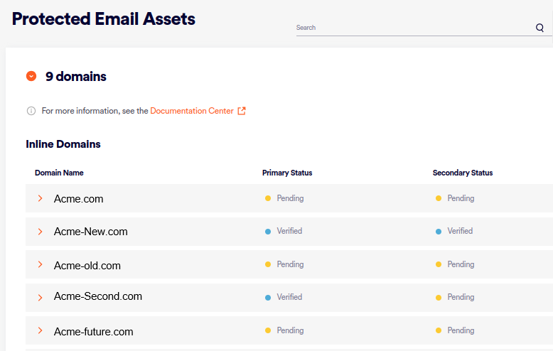 Note: When the "protect all" option is selected, you won't be able to select a domain, and then disable or delete the domain. To delete or disable a domain, first change the organization protection to "Protect selected email assets"