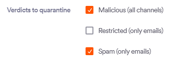 Note: When you select verdicts to be quarantined, "Acronis Email Security" will quarantine all future emails that have the selected verdicts - emails that were received previously will not be quarantined.