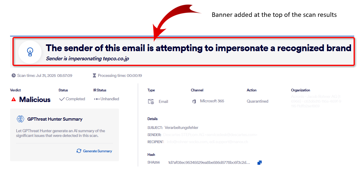 The "Acronis Email Security" IR Team can configure "Acronis Email Security" to automatically add the Highlighted tag to the results of a scan. When the Highlighted tag is added, a detection-specific banner is typically added at the top of the scan results. This banner provides a brief description of a significant detection in the scan. The Highlighted tag and associated banner are typically added because the "Acronis Email Security" IR Team wants to emphasize specific malicious behavior that was detected in the scan - usually related to an important attack-type.