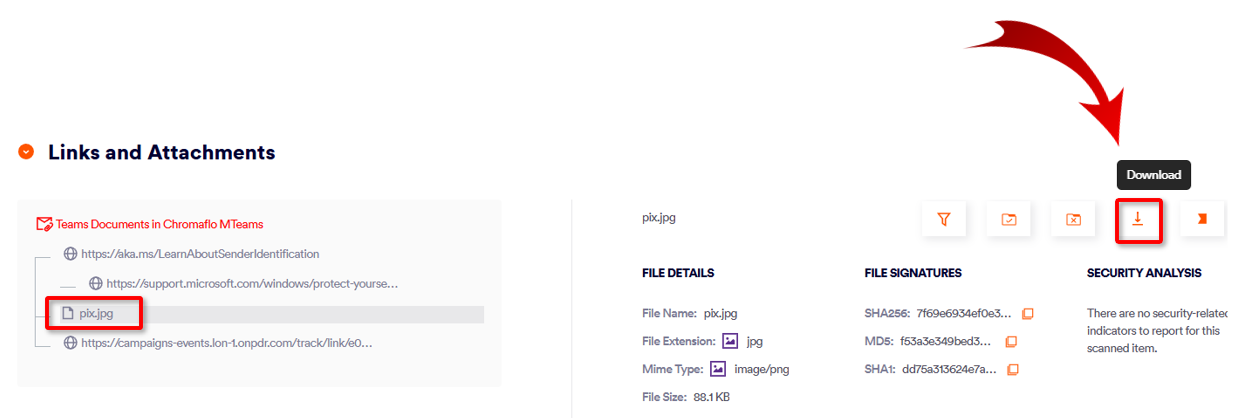 Downloads the email or file to your Downloads folder. This may be useful if you want to do further analysis of the email or file. The email or file will be downloaded with a .danger extension appended to it. You can remove the .danger extension - to be left with a .eml file [for emails] that you'll be able to open.