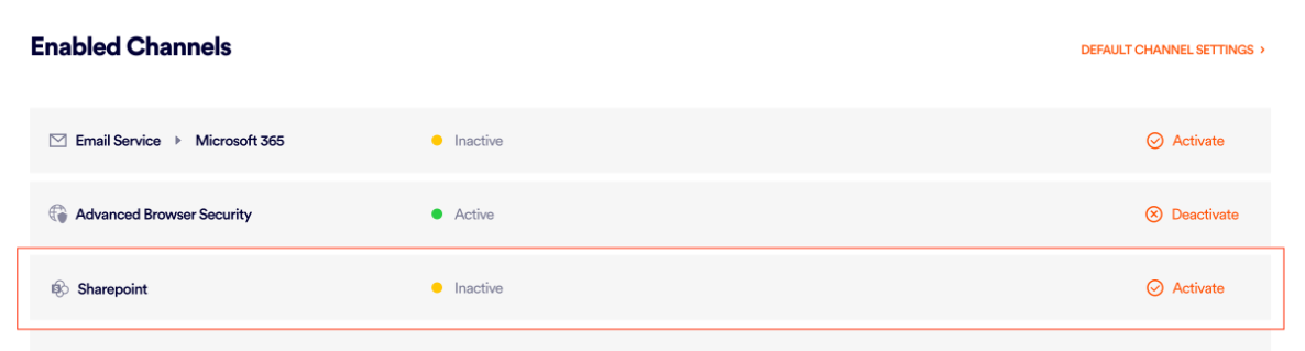 Under Enabled Channels, locate "SharePoint" and then click "Activate".
