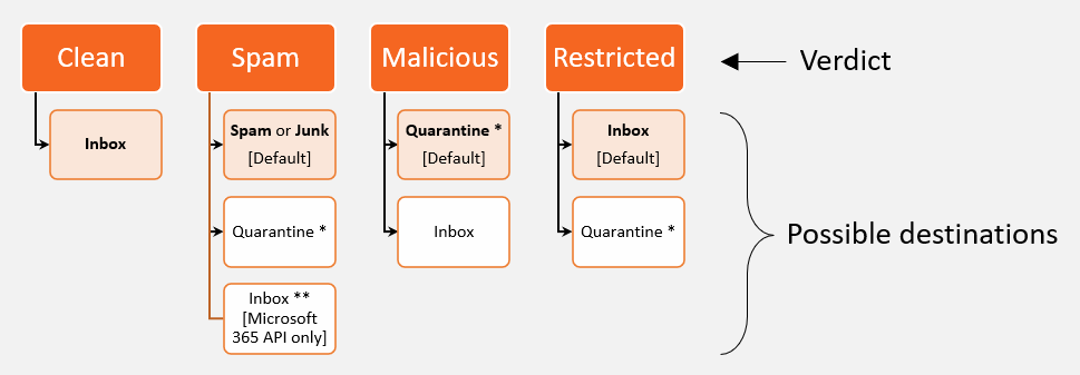 Depending on the verdict that is assigned to the scan of an email, the email will be delivered to a specified destination. The destination for each verdict can be configured. The diagram below shows the available destinations and the default destinations for each verdict.