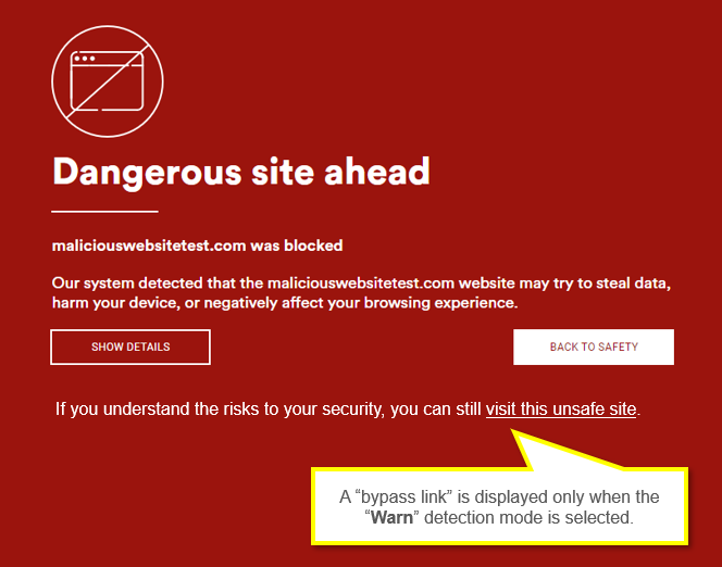 Block pages are displayed only if the selected detection mode is either Block or Warn. If the selected detection mode is either Disabled or Silent, no block pages will be displayed. For details on detection modes, see Detection Settings.