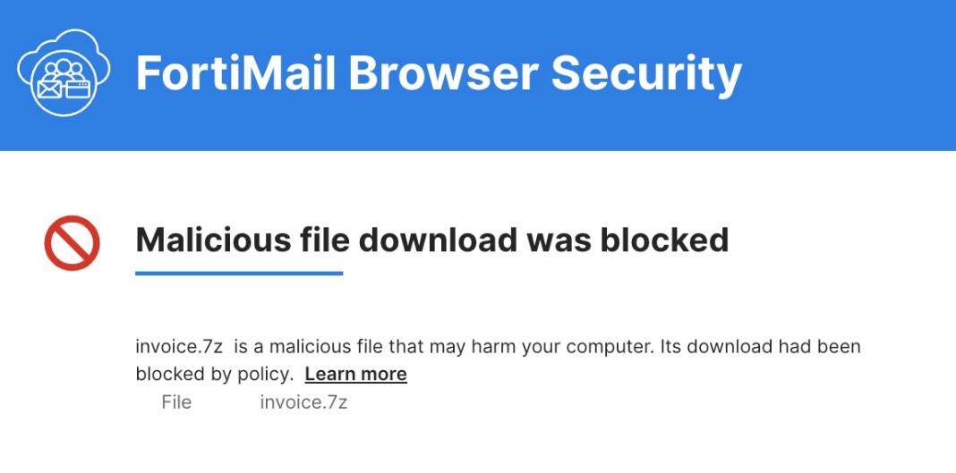 To enhance security, when an end-user uses a browser that is protected by FortiMail Browser Security, various block pages may be displayed to the end-user. The block pages may limit or restrict the end-user's access when the end-user tries to: