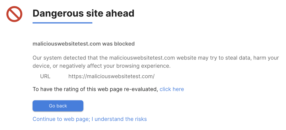 Malicious URLsWhen the Warn detection mode is configured, users can bypass any block page that appears, in order to access the relevant URL. Bypassing a block page is recommended only if the user understands the potential risk - or believes that the URL is safe. Two by-pass options are displayed: