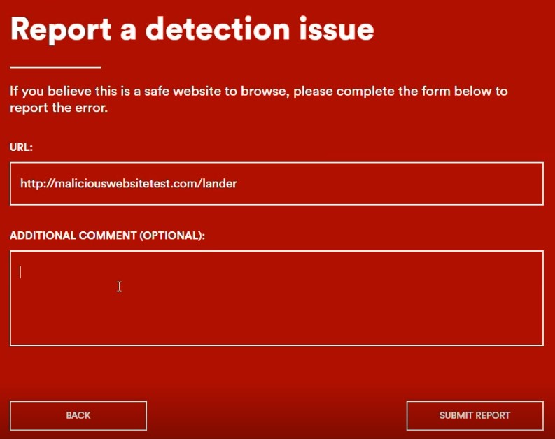 When the Block detection mode is selected, users are not able to bypass any block pages that appear. Block pages in Block mode prevent the user from accessing the relevant downloaded file or the relevant URL. "Block" website block pages enable users to "report a detection issue." Users can "report a detection issue" when a block page appears for a certain site, but the user believes that the site is safe to visit. After submitting the issue, the user will be not be given access to the site - until the site is approved by the FortiMail Workspace Security IR Team. |