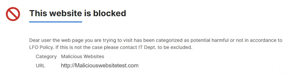 When the Block detection mode is configured, users are not able to bypass any block pages that appear. Block pages in Block mode prevent the user from accessing the relevant URL or the relevant downloaded file.
