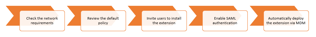 FortiMail Browser Security is deployed as a browser extension, adding advanced detection, DLP, and governance capabilities to standard browsers. This page will help you deploy and configure the extension, using the following 5-step procedure: