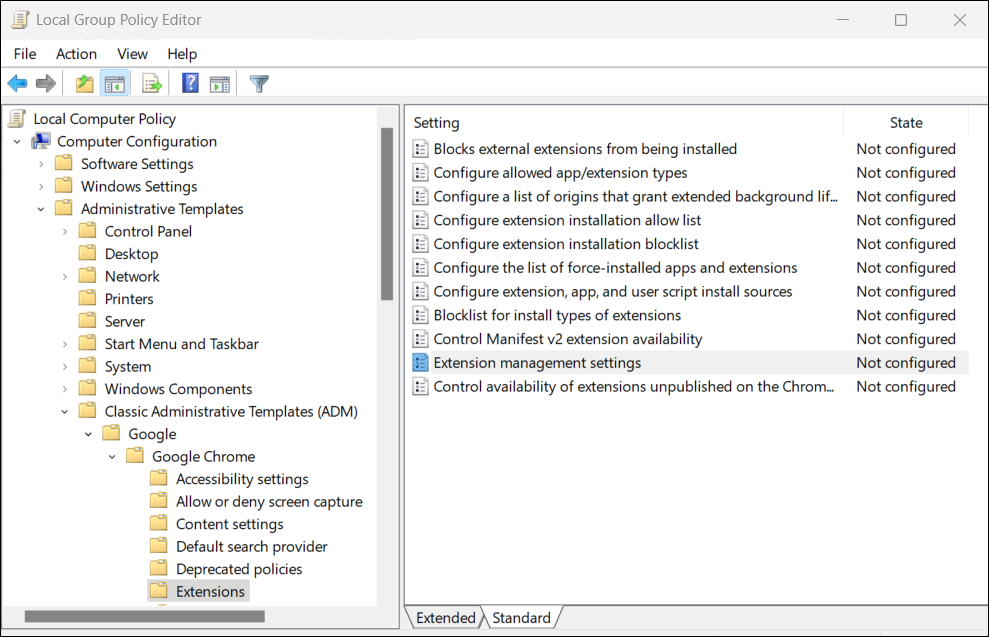 Navigate to Computer Configuration > Administrative Templates > Classic Administrative Templates (ADM) > Google > Google Chrome > Extensions, and open Extension management settings.