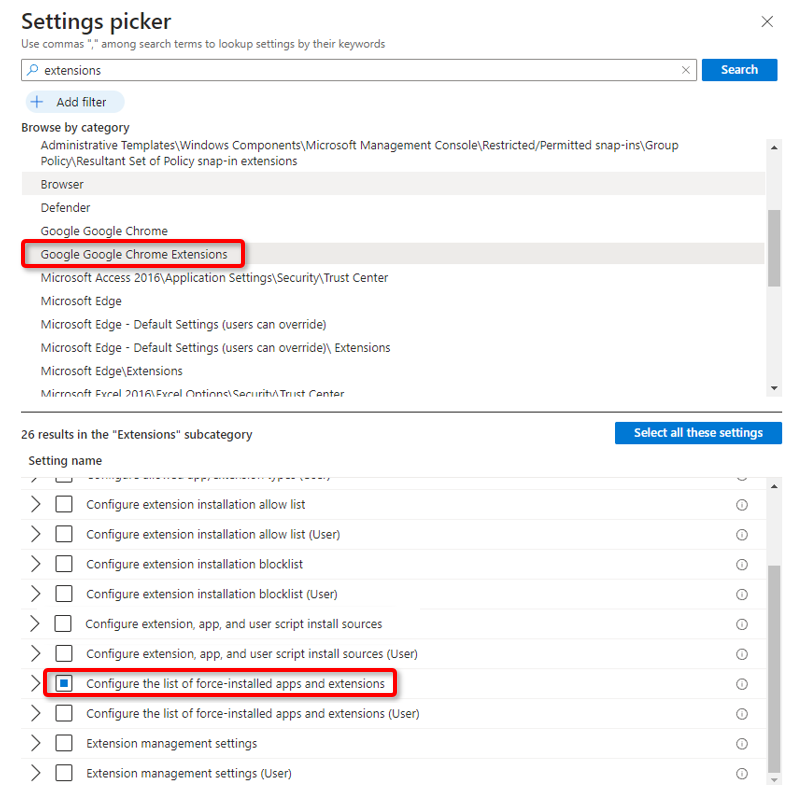 Under Google Chrome > Extensions, enable Configure the list of force-installed apps and extensions