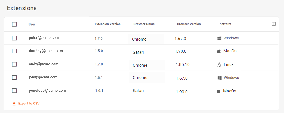The Users > Security Extensions page provides administrative information about the FortiMail Browser Security Browser Extensions that have been installed by the end users in your organization.