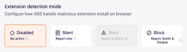 Warn [This mode is currently not available] If a user tries to enable an extension that has the Malicious or Suspicious verdict, the user will be warned that the extension is malicious or suspicious. The user will be able to continue to enable the extension, or to abort the attempt. An event will be added to the Extension Activity log. For details, see Events Page. |
