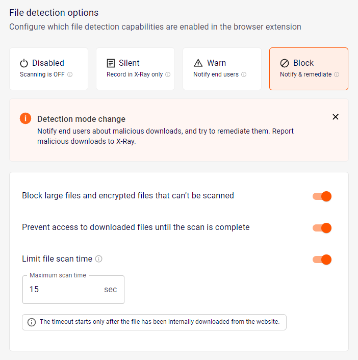 Prevent access to downloaded files until the scan is complete [appears only if the Block or Warn detection mode is selected above] |