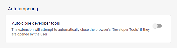 When enabled, the extension will attempt to close the browser's "Developer Tools" - if the tools are opened by an end-user. |