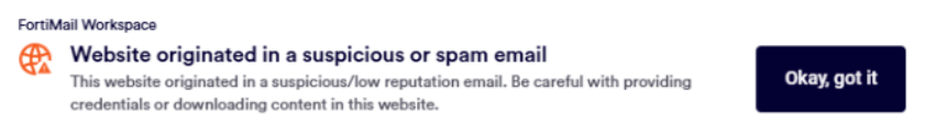 When an end-user visits a website that originated in a suspicious or low reputation email*, then a warning will be displayed for the end-user. These users should then be careful when providing credentials or downloading files from that site.