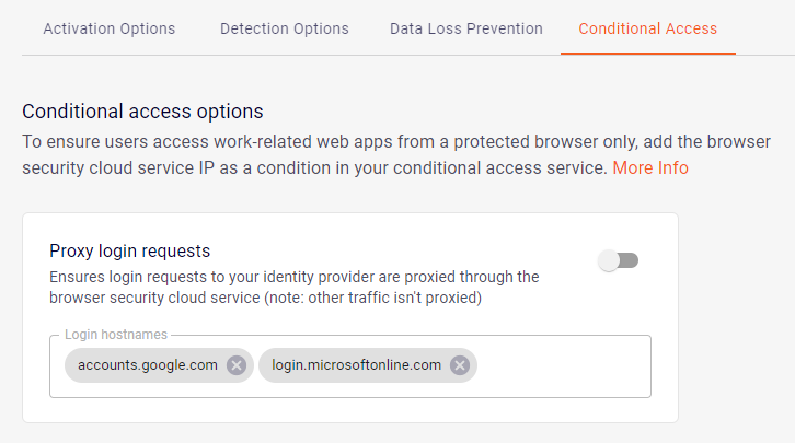 Conditional Access options Lets you enforce that users access specific work-related web apps from protected browsers only - browsers that have the extension installed. For details, see Conditional Access Integration. |