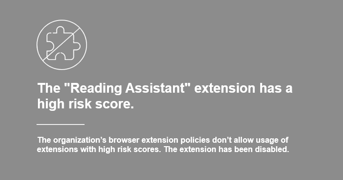 A block-page is displayed in a new browser tab, explaining to the end-user that the extension was not enabled - due to the organization's browser extension policies that don't allow extensions with specified risk levels.