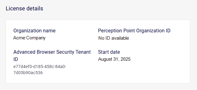 Perception Point Support may request this FortiMail Browser Security Tenant ID when troubleshooting. You may also need it when you log a service request with Perception Point Support. |
