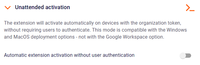 Note: An organization token must be deployed in your organization to enable unattended activation to function. For details, see Step 2: Connecting the extension via UEM solutions [Generic]. |