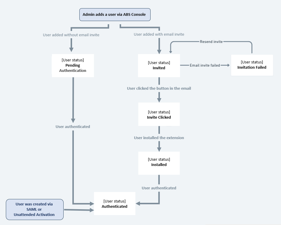 Each end user in the FortiMail Browser Security console can have one of the statuses below. The available statuses depend on the flow that was used to add the user to the system: