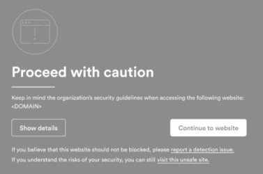 The specified custom message will appear when a user tries to access a domain, or a website in a category, that is blocked or that has been configured to trigger a warning message when access is attempted - in a website rule. These custom messages can be useful for presenting specific warnings or corporate policy information related to a specific website (for example, a Generative AI website) or category.