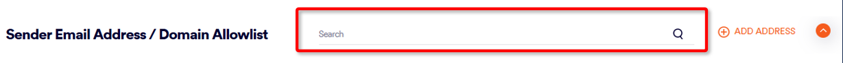 Sometimes allowlists may contain many entries. Finding a specific entry in a long allowlist may not be so simple. For example, your "Sender Email Address / Domain" allowlist contains 245 entries, and you want to see all entries that include "example.com". You can use the Search facility at the top of each allowlist.