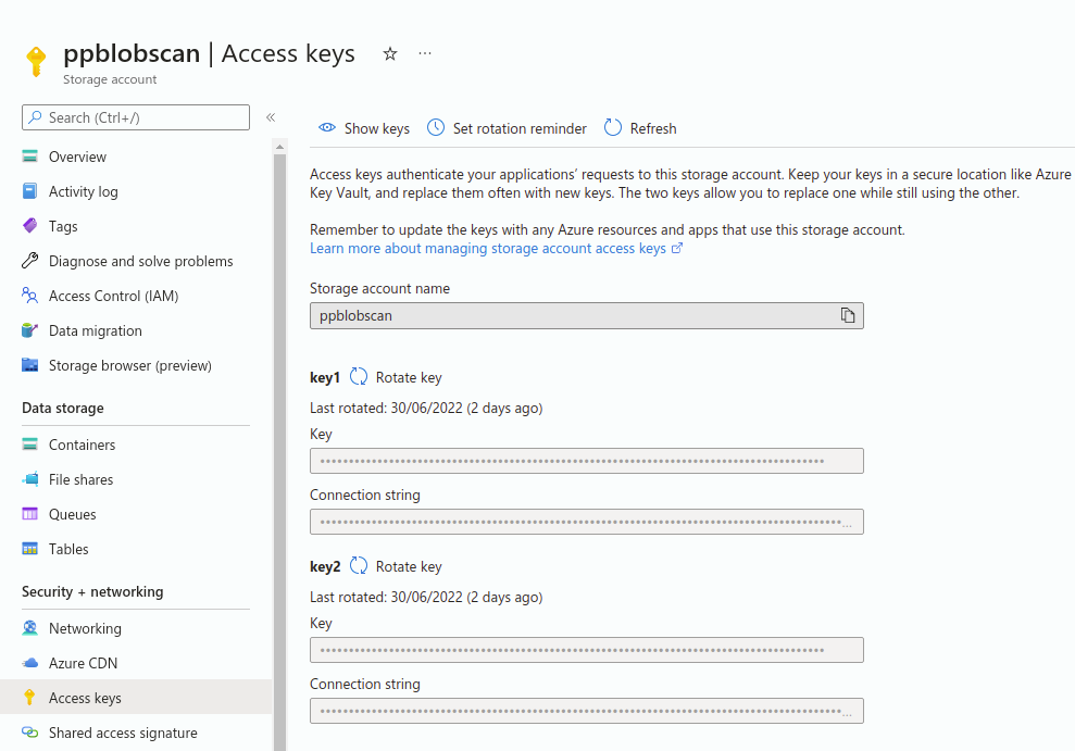 The Storage Account connection string can be found under Access Keys in the Storage Account settings page. Click Show keys, and then copy the connection string of one of the available keys.