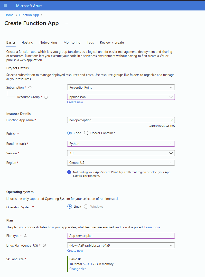 Python 3 based Azure Function App using App Service Plan (See Function App configuration below)