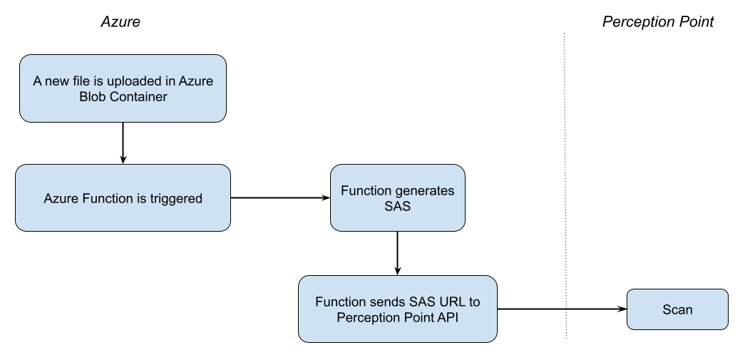 FortiMail Workspace Security can be integrated with various products. This page explains what configurations are required to integrate FortiMail Workspace Security with Azure Blob - to enhance your Azure Blob security. Perception Point’s Azure Blob Threat Detection [ABTD] monitors your Azure Blob Storage account containers for malicious file uploads. This page describes what must be performed by FortiMail Workspace Security Support and what must be performed by you, the customer, to perform the integration.
